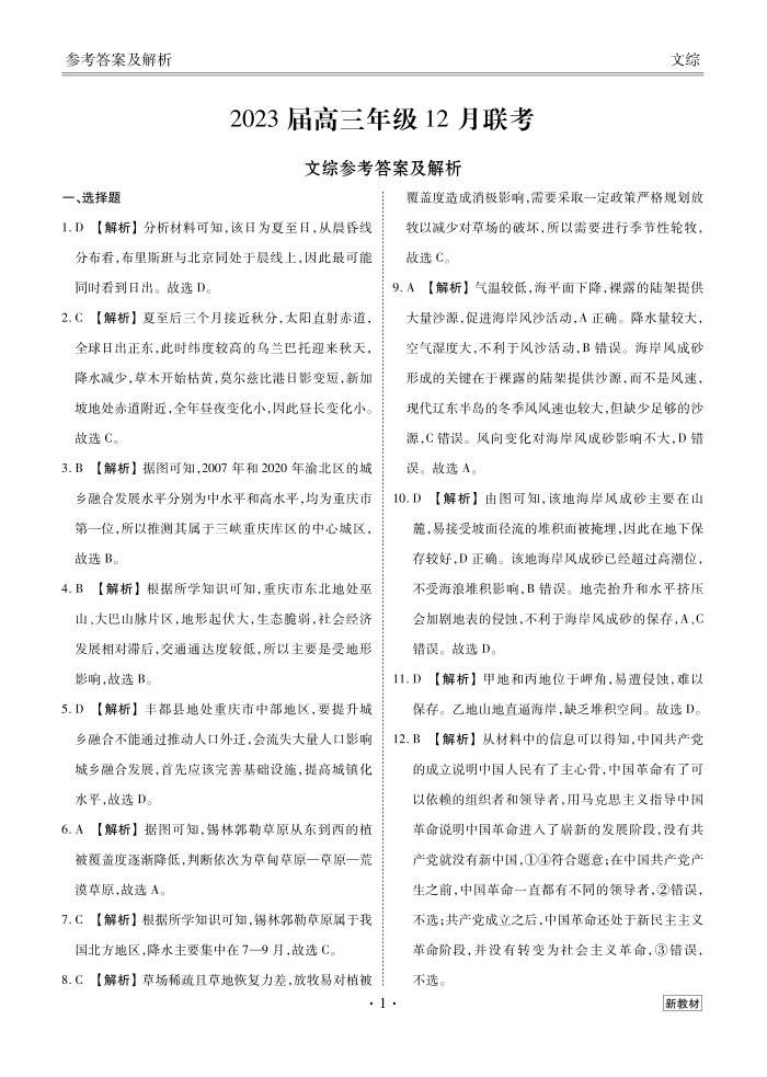 高三文综答案--山西省衡水金卷2023高三12月联考