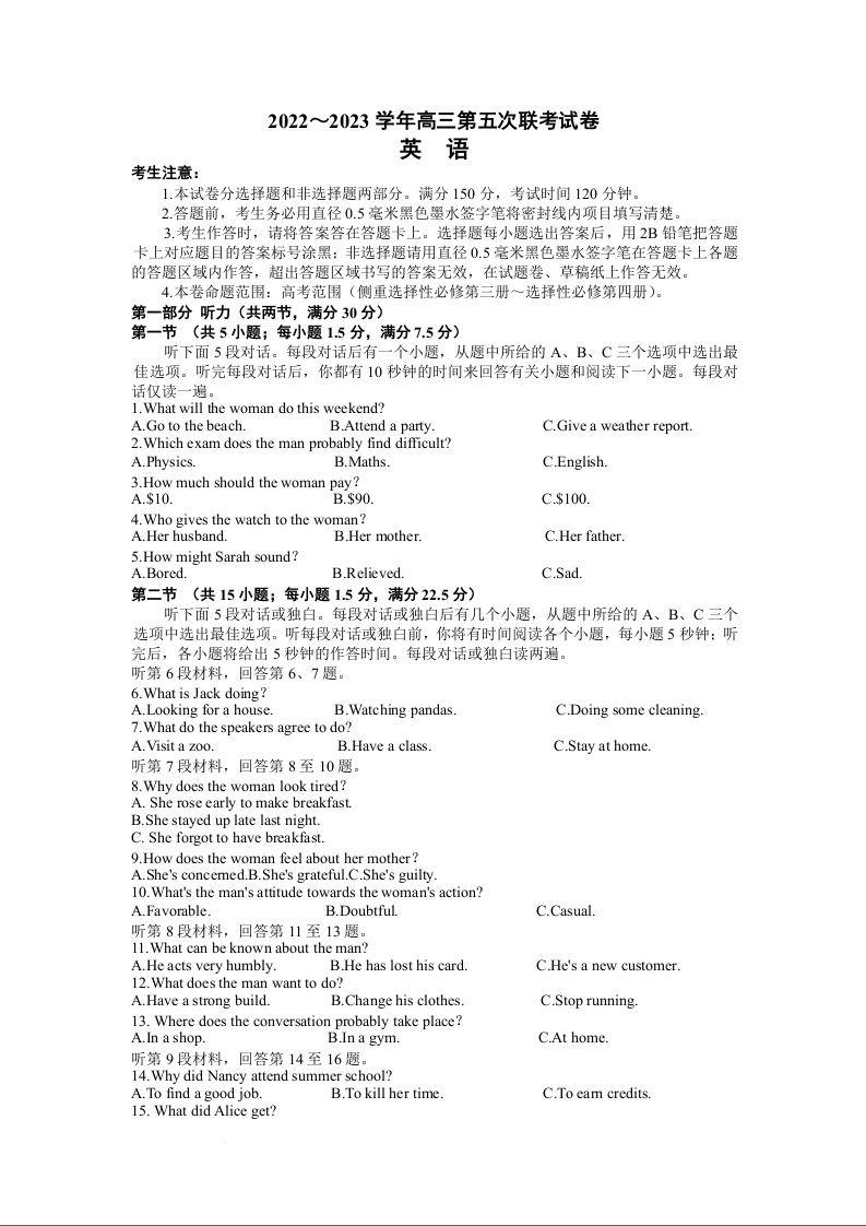 高三英语+答案--山西省部分学校2022-2023学年高三上学期第五次联考
