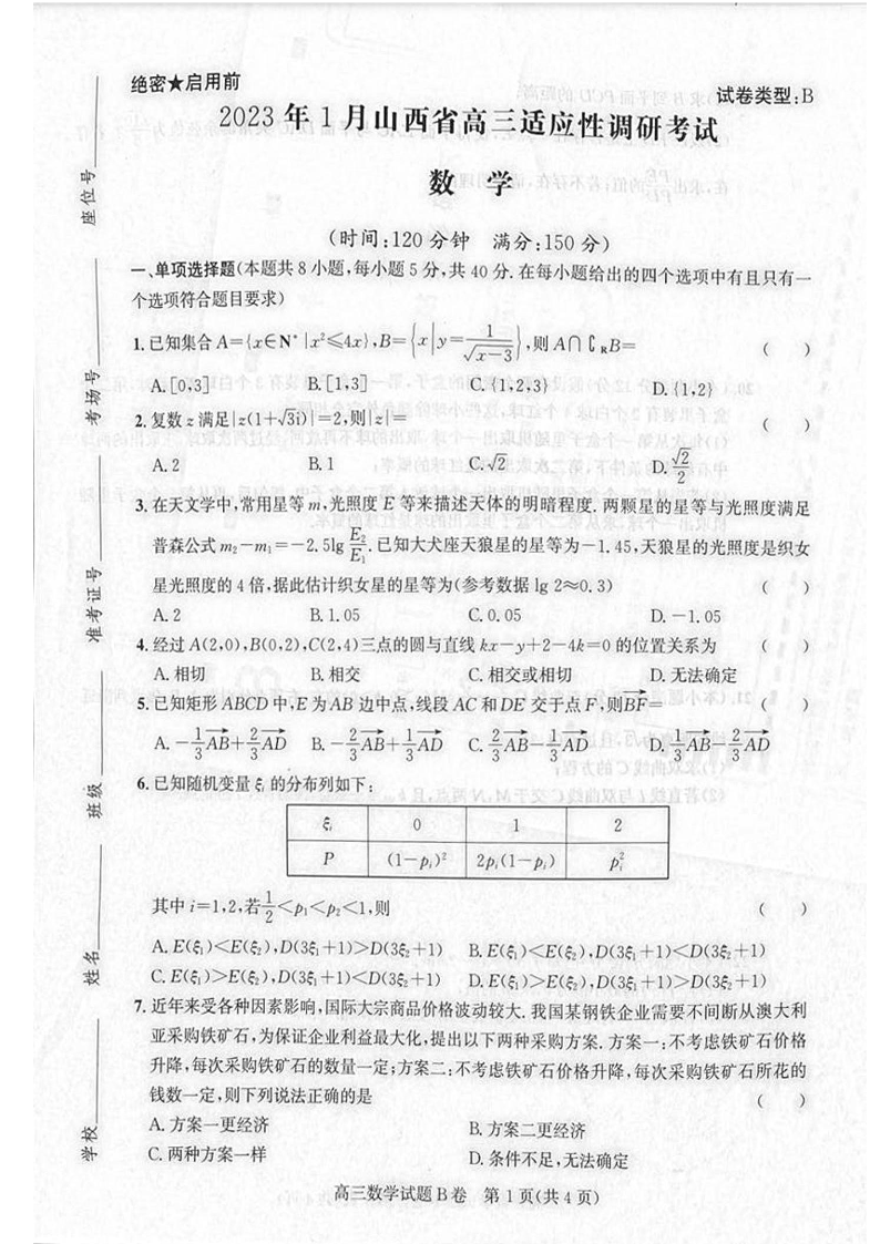 高三数学B卷--山西省2023年1月高三年级适应性调研测试