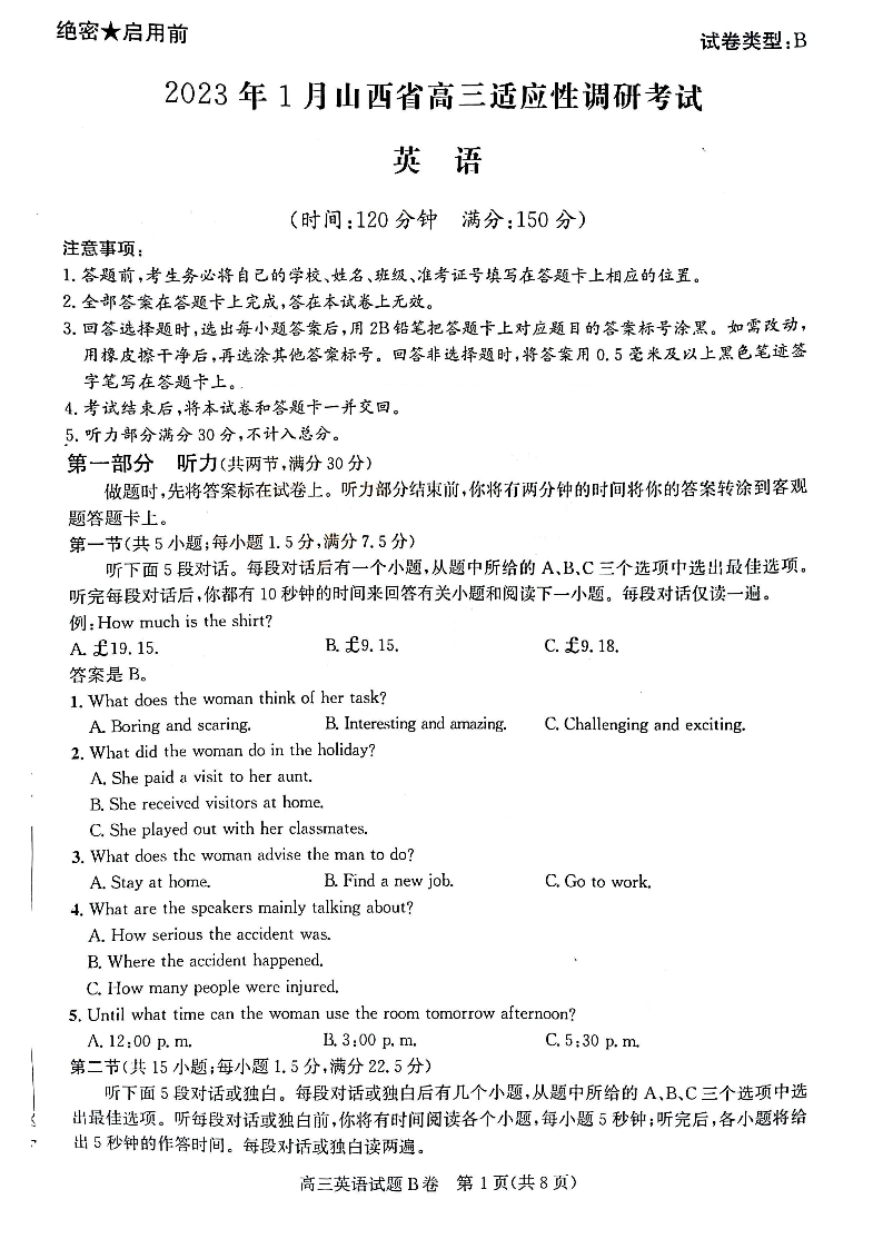高三英语B卷--山西省2023年1月高三年级适应性调研测试