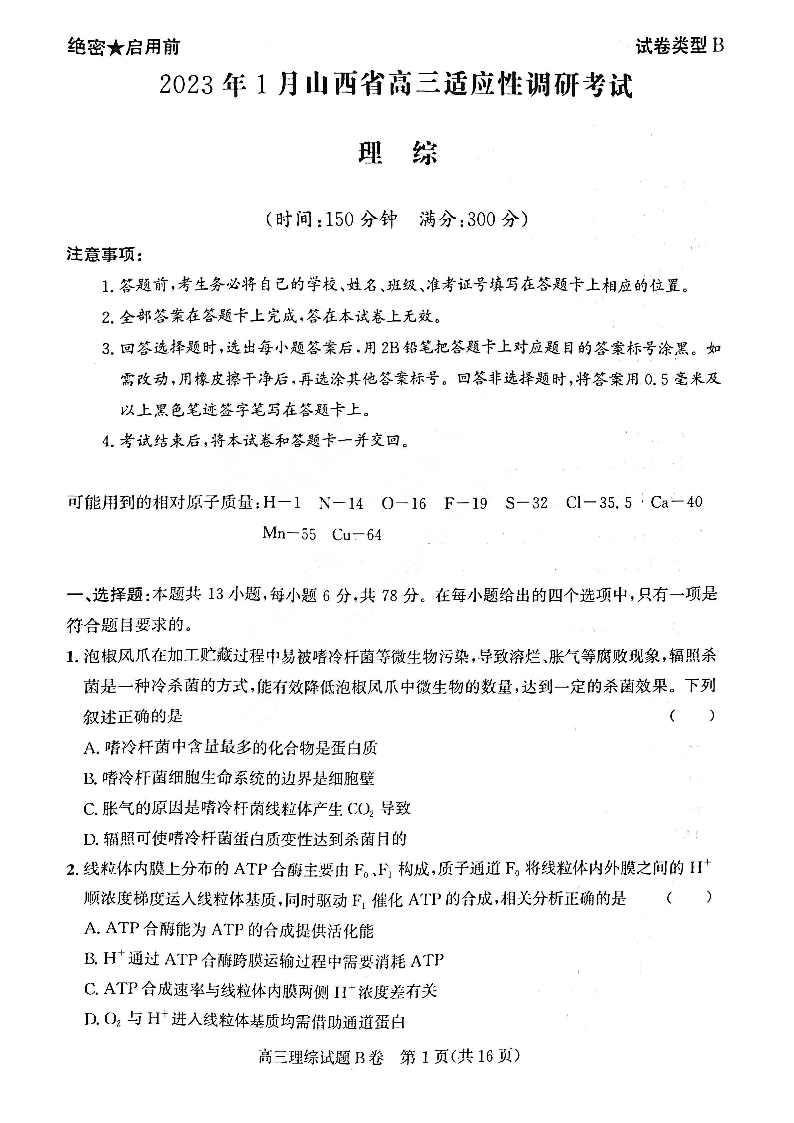 高三理综B卷--山西省2023年1月高三年级适应性调研测试