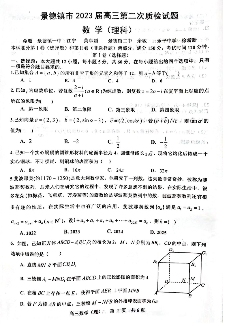 高三数学(理科)+答案--江西省景德镇市2023届高三上学期第二次质量检测