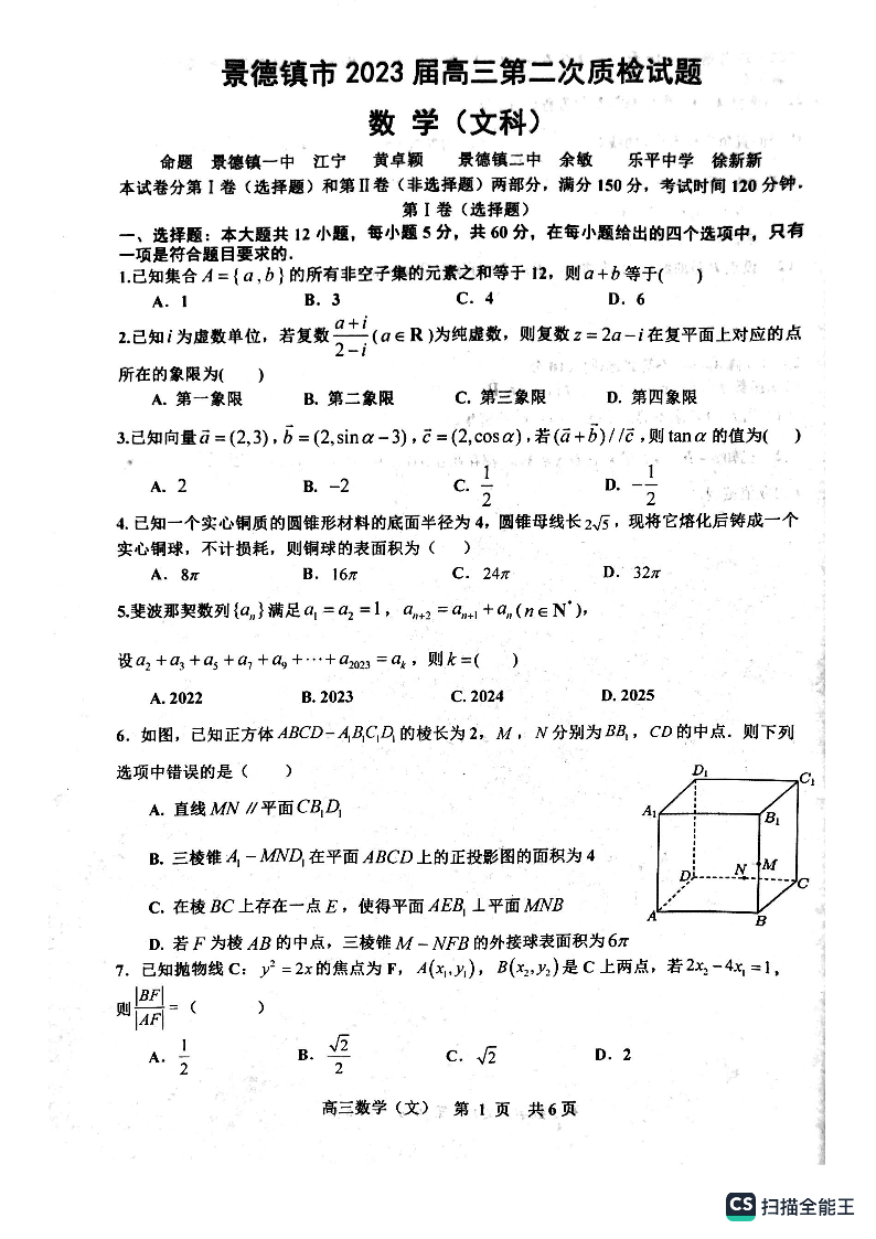 高三数学(文科)--江西省景德镇市2023届高三上学期第二次质量检测