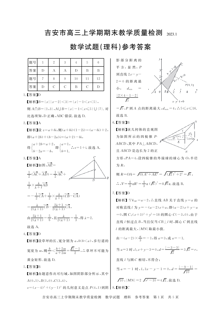 高三理科数学答案--江西省吉安市2023高三上学期1月期末质量检测