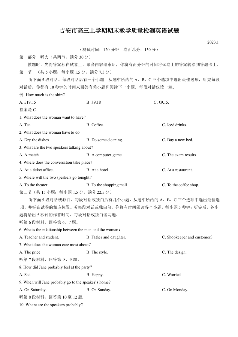 高三英语+答案--江西省吉安市2023高三上学期1月期末质量检测