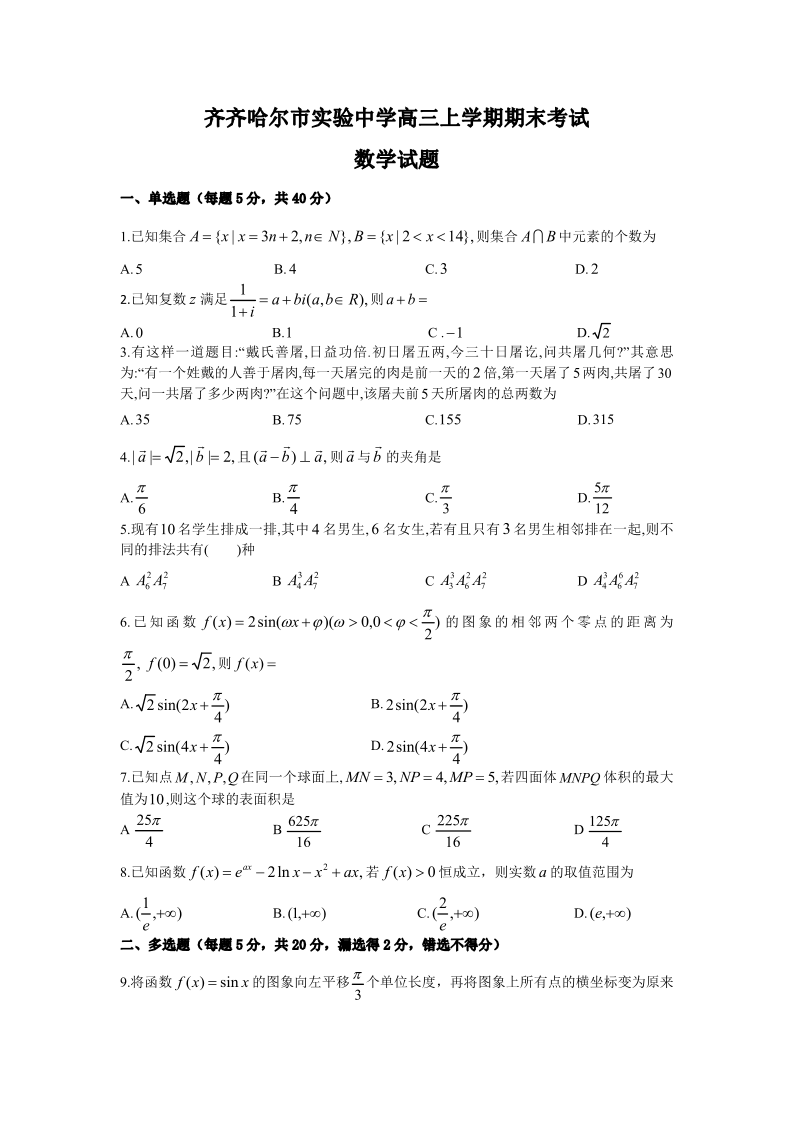 高三数学--黑龙江省齐齐哈尔市2023高三上学期期末考试