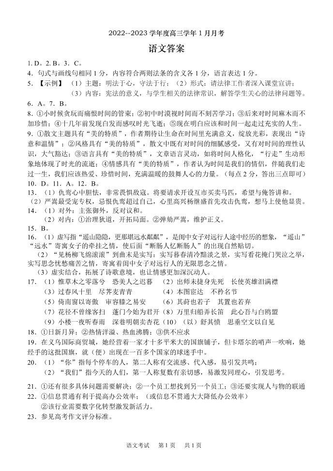 高三语文答案--黑龙江省哈尔滨市第三中学2022-2023学年高三1月月考