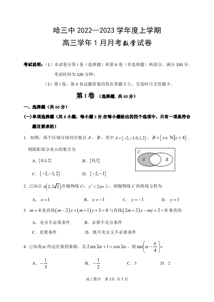 高三数学--黑龙江省哈尔滨市第三中学2022-2023学年高三1月月考