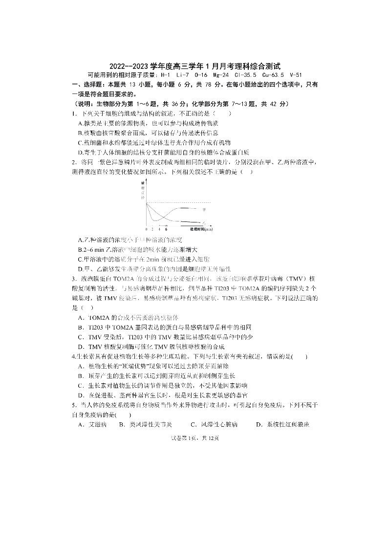 高三理科综合--黑龙江省哈尔滨市第三中学2022-2023学年高三1月月考