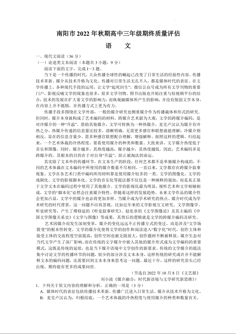 高三语文--河南省南阳市2023届高三上学期期终质量评估