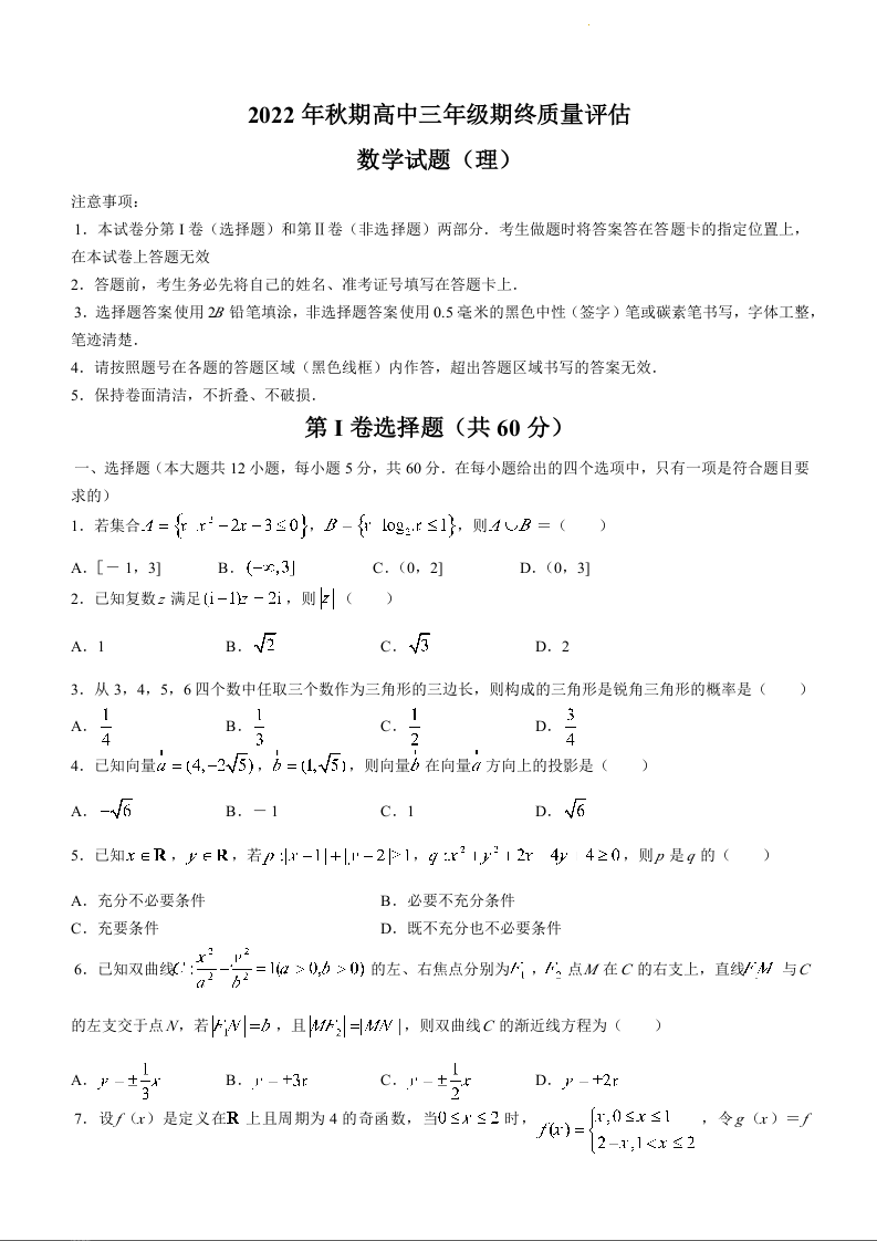 高三数学(理)--河南省南阳市2023届高三上学期期终质量评估