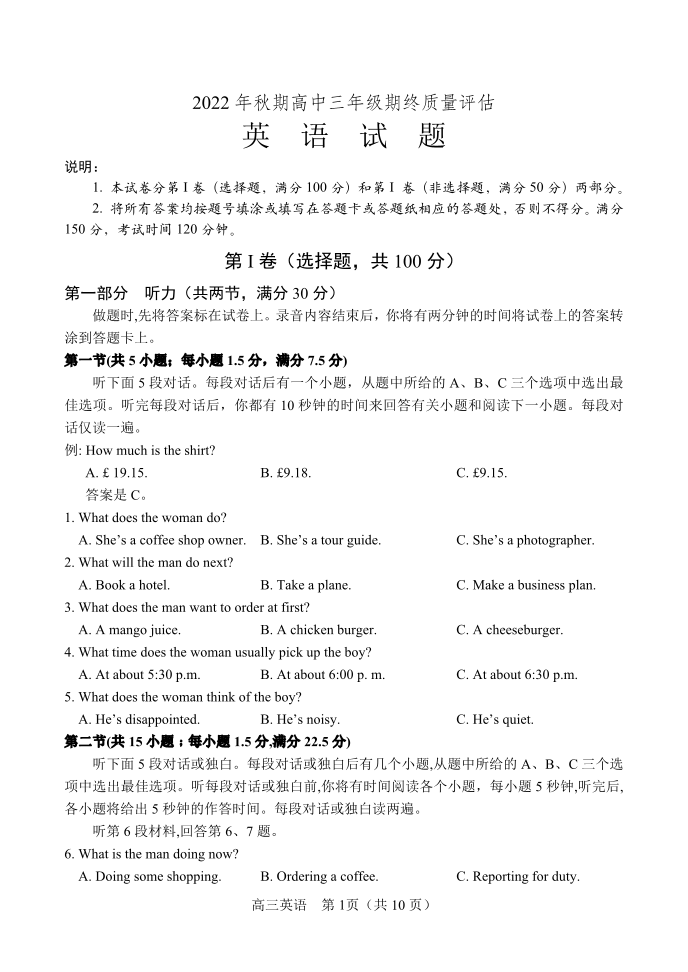 高三英语--河南省南阳市2023届高三上学期期终质量评估