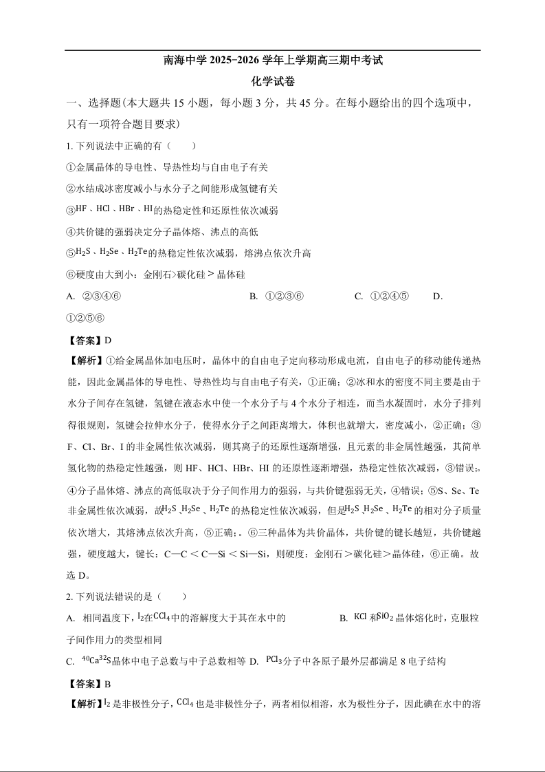 高三化学答案--广州市南海中学2025-2026学年高三上学期10月期中考试