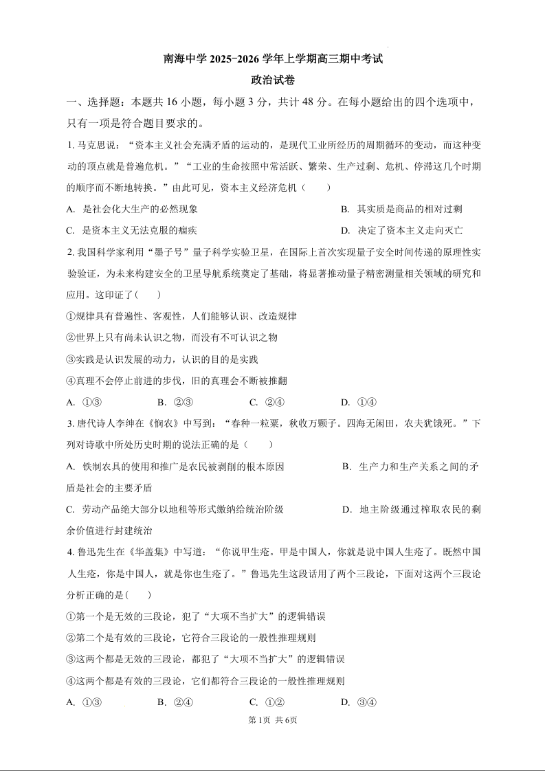 高三政治--广州市南海中学2025-2026学年高三上学期10月期中考试