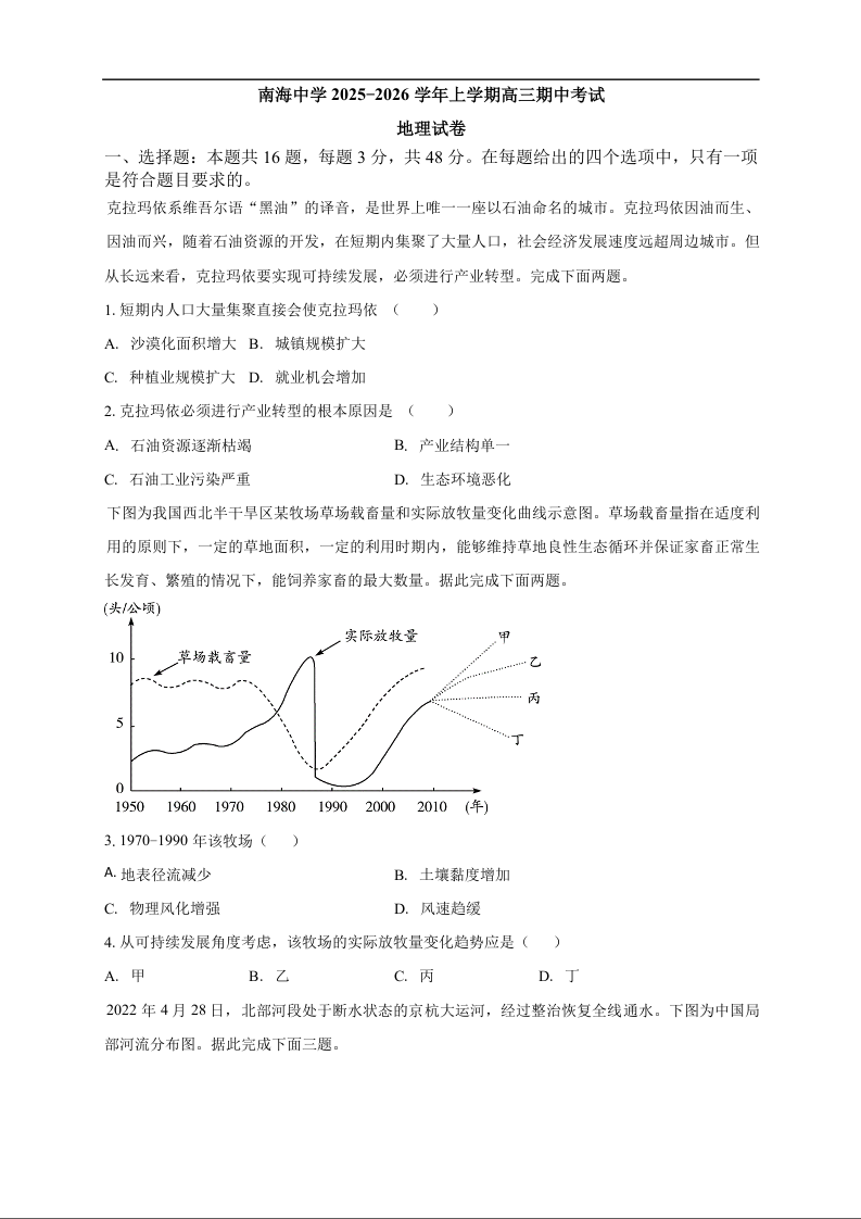 高三地理--广州市南海中学2025-2026学年高三上学期10月期中考试