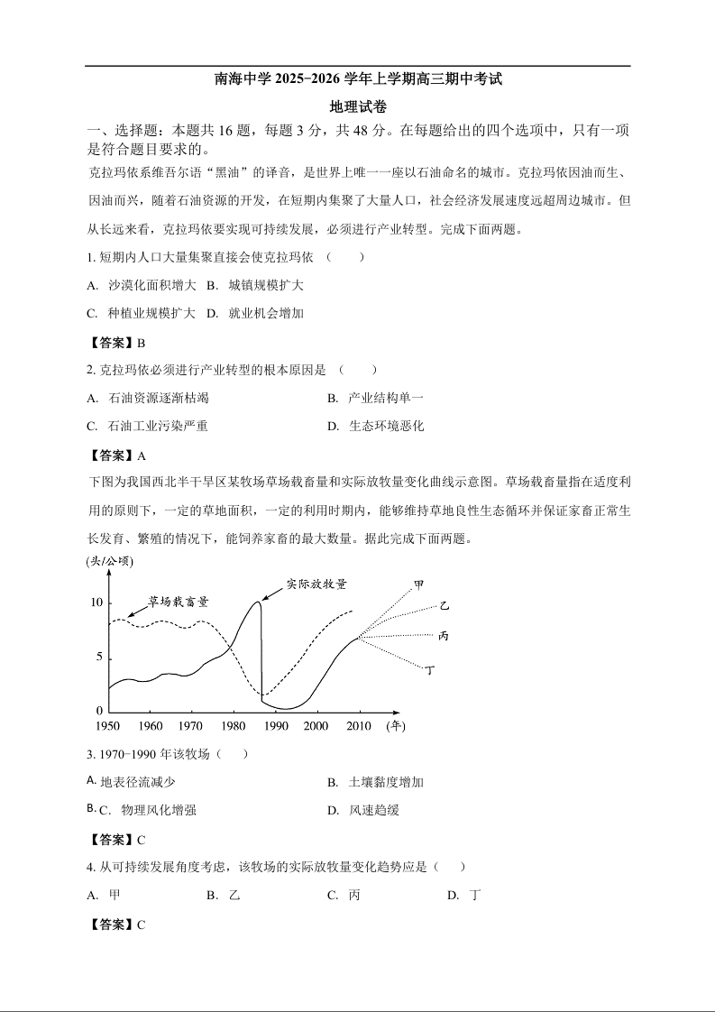 高三地理答案--广州市南海中学2025-2026学年高三上学期10月期中考试
