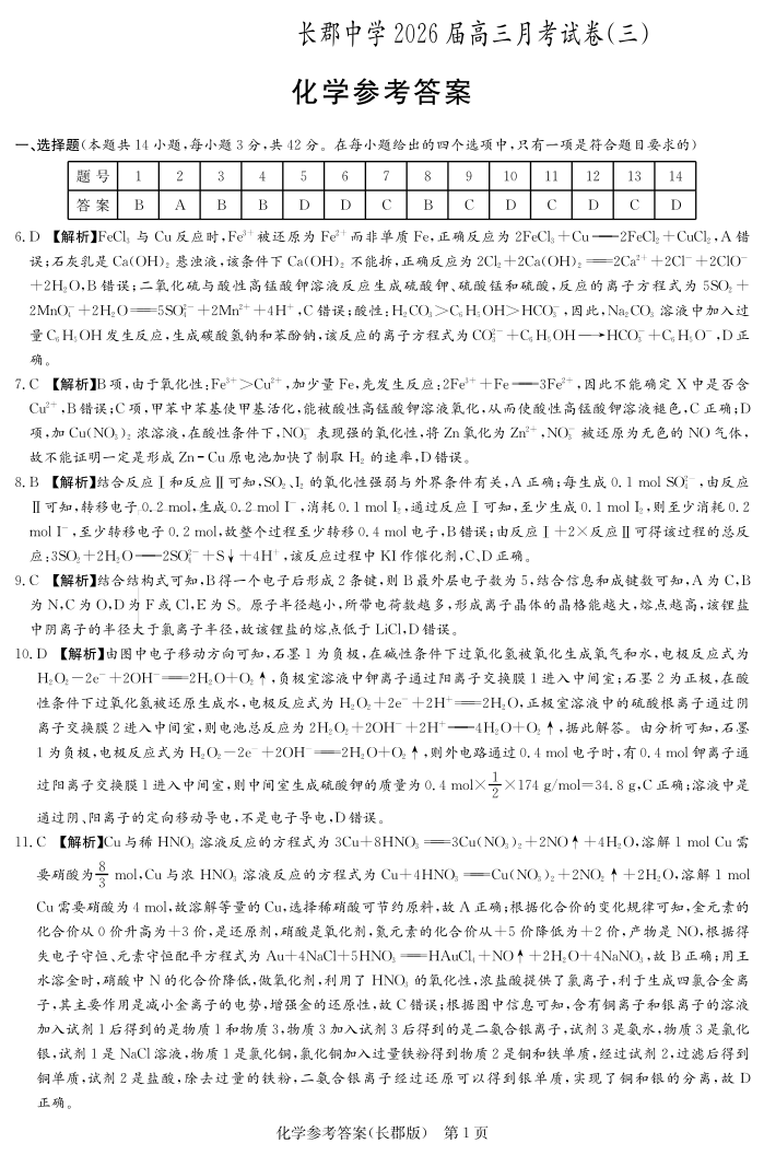高三化学答案--湖南省长郡中学2026届高三上学期11月月考