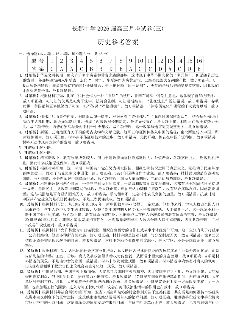 高三历史答案--湖南省长郡中学2026届高三上学期11月月考