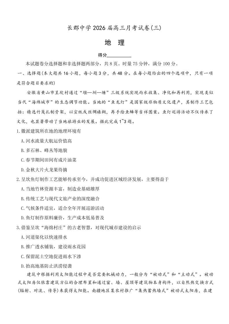 高三地理+答案--湖南省长郡中学2026届高三上学期11月月考