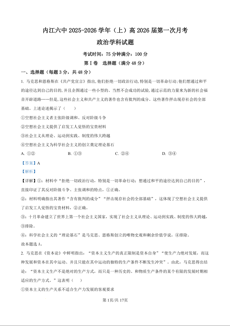 高三政治(精品解析版)--四川省内江市六中2026届高三上学期第一次月考