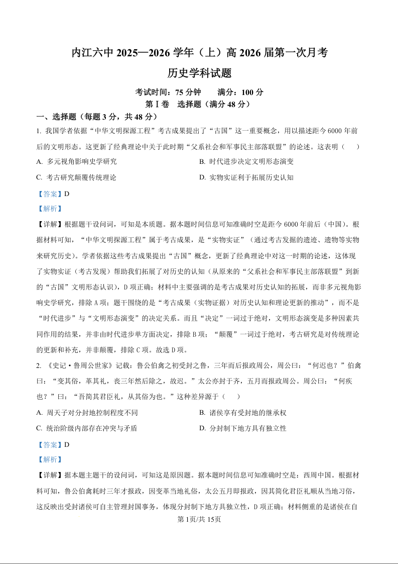 高三历史(精品解析版)--四川省内江市六中2026届高三上学期第一次月考