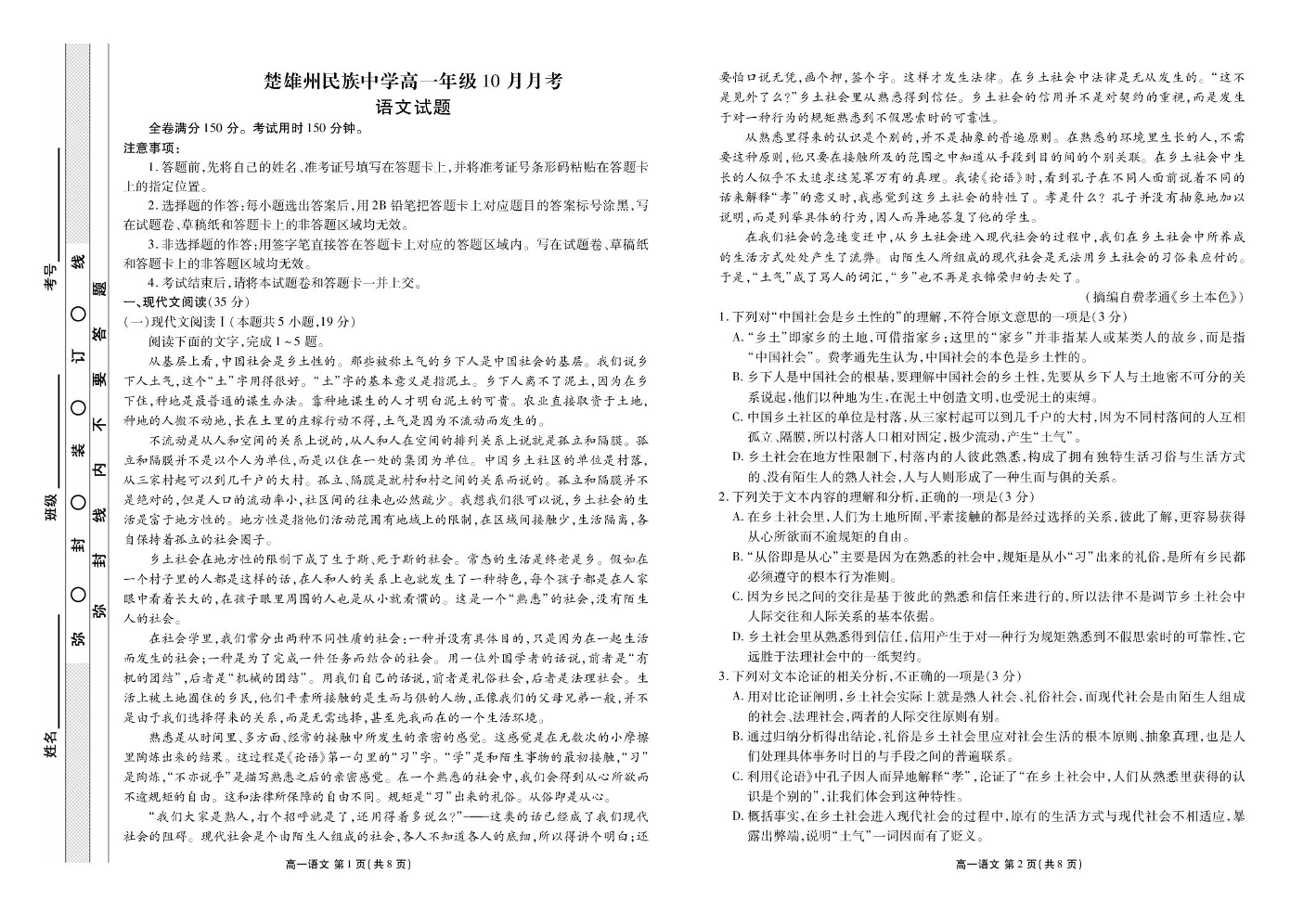 高一语文--云南省楚雄彝族自治州民族中学2025-2026学年高一上学期10月月考
