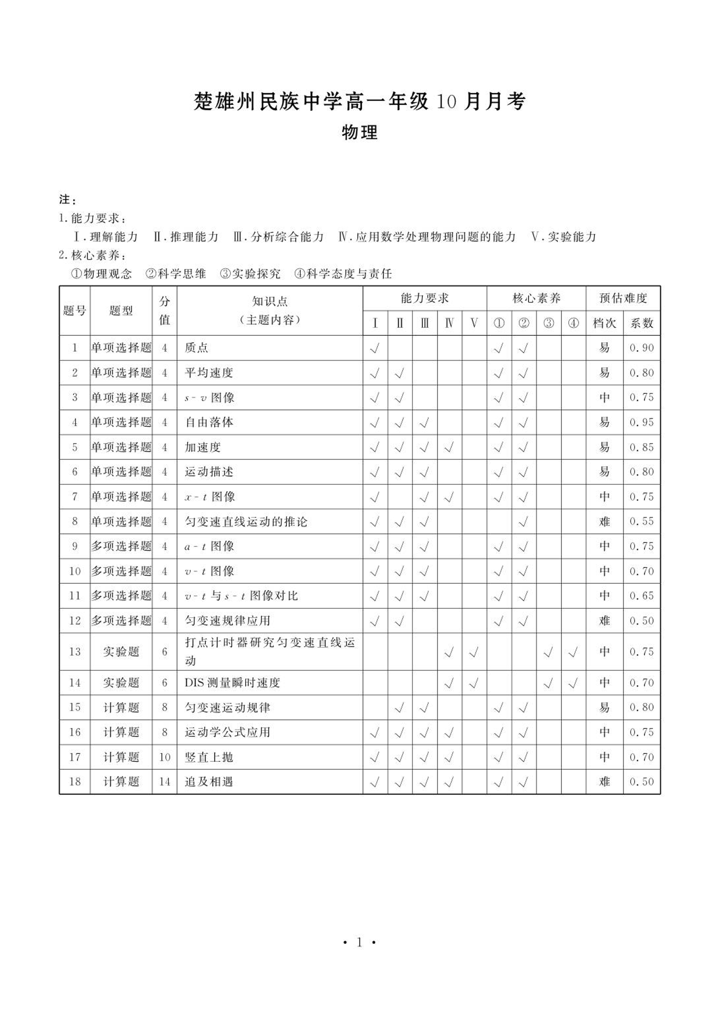 高一物理答案--云南省楚雄彝族自治州民族中学2025-2026学年高一上学期10月月考