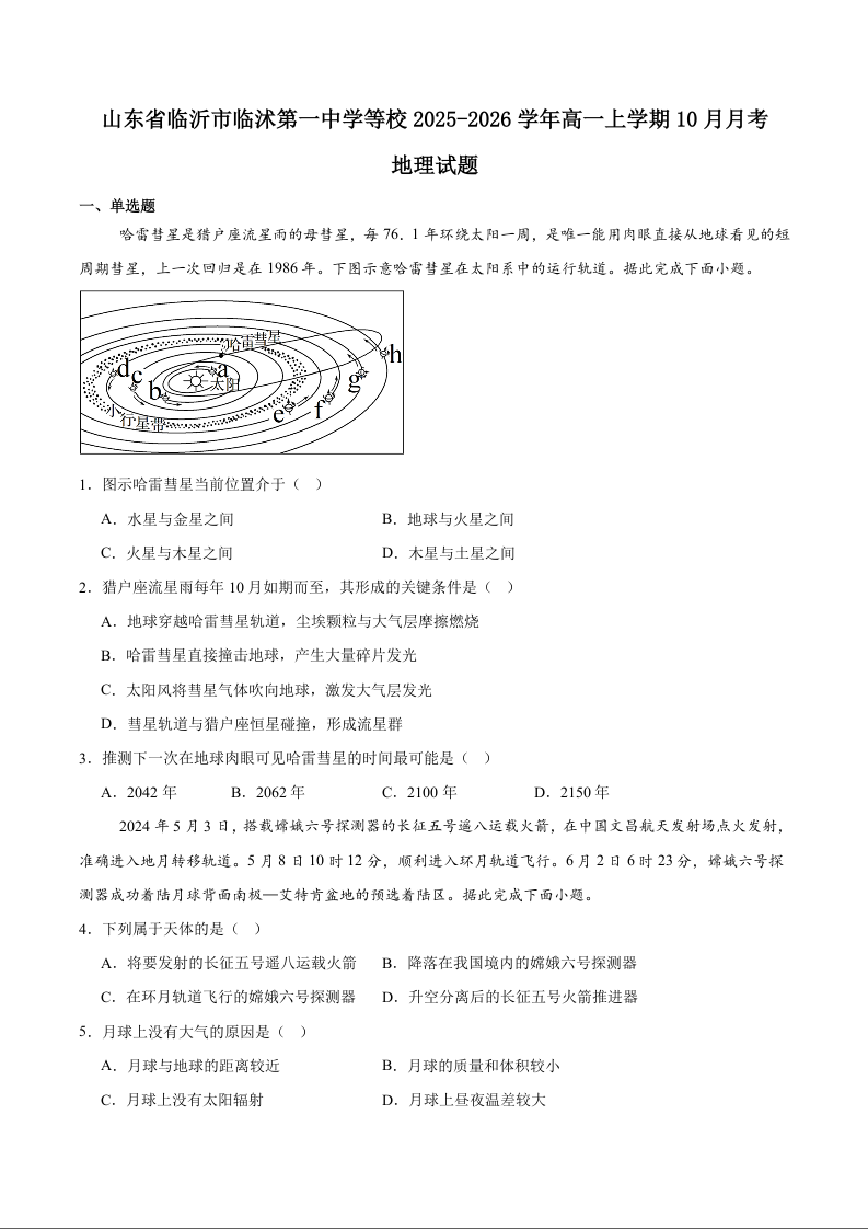 高一地理+答案--山东省临沂市部分学校2025-2026学年高一上学期10月联考