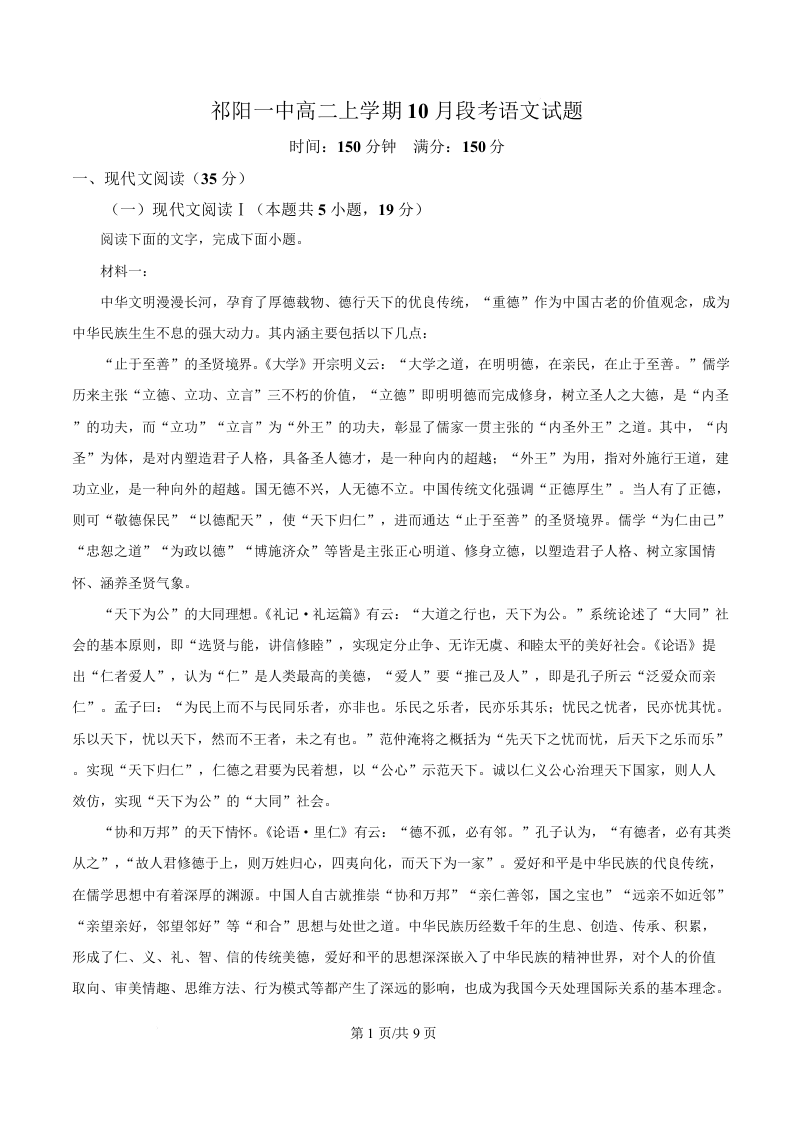 高二语文(原卷版)--湖南省祁阳市第一中学2025-2026学年高二上学期10月月考