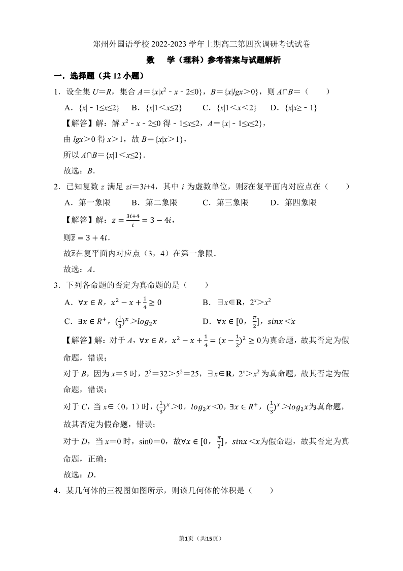 高三理科数学答案--河南省郑州外国语学校高三上学期1月调研考试(四)