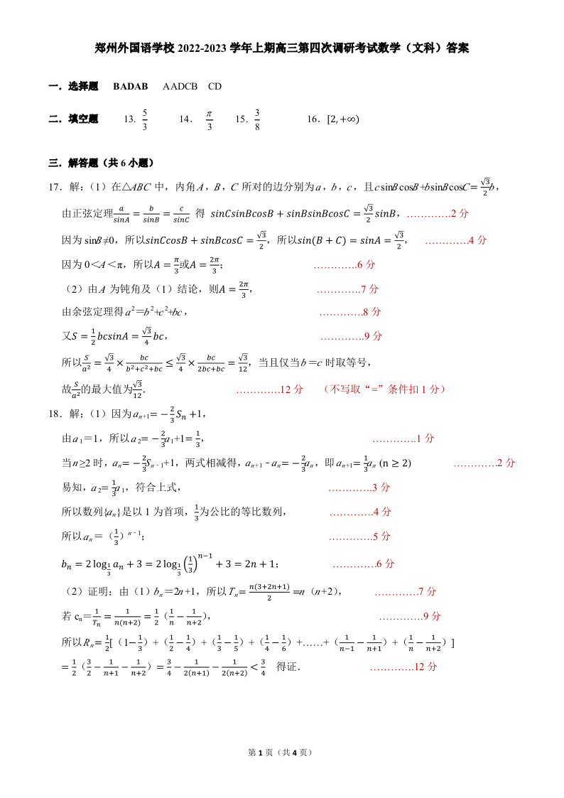 高三文数答案--河南省郑州外国语学校高三上学期1月调研考试(四)