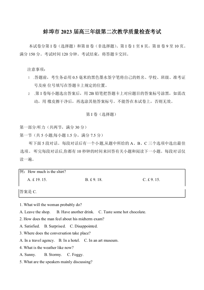 高三英语+答案--安徽省蚌埠市2023届高三第二次教学质量检查考试