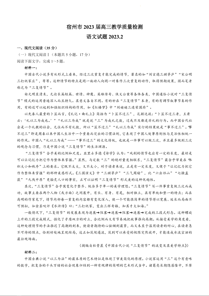 高三语文+答案--安徽省宿州市2023届高三教学质量检测(一模)