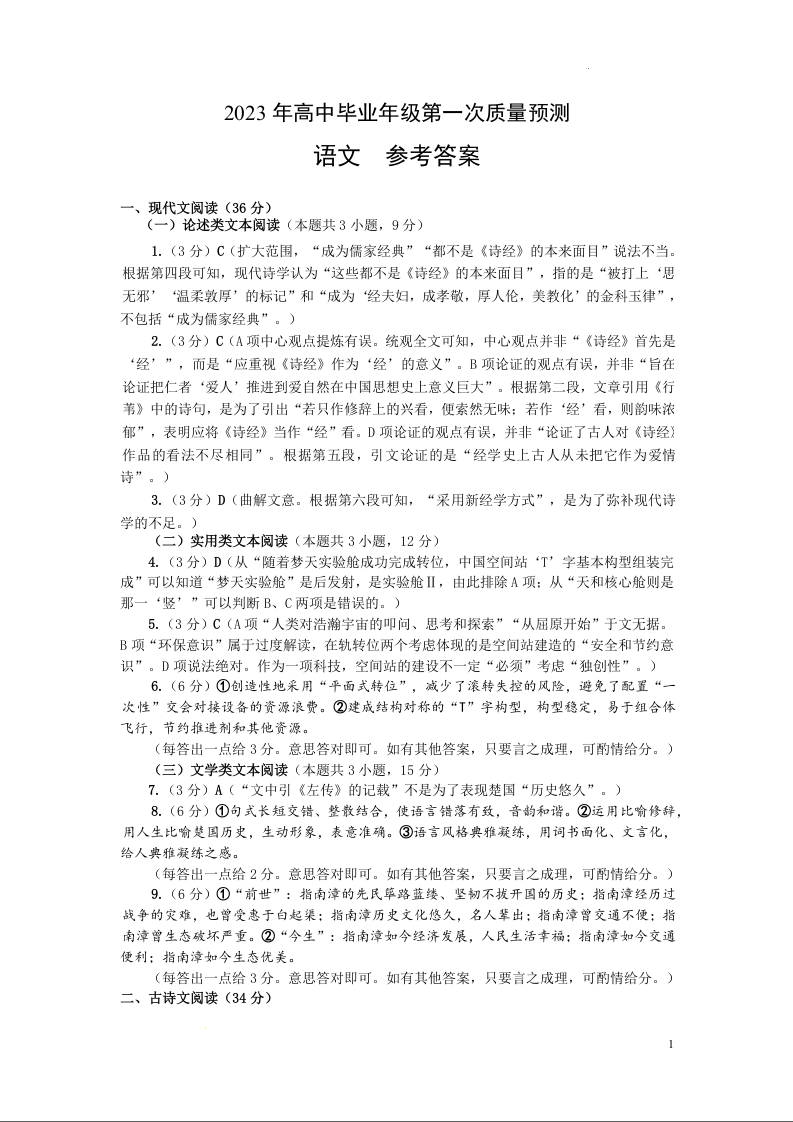 高三语文答案--河南省郑州市2023届高中毕业年级第一次质量预测