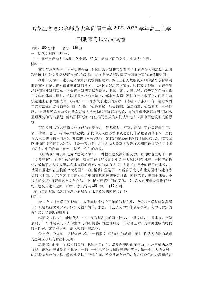 高三语文+答案--黑龙江省哈尔滨师范大学附属中学高三上学期期末考试