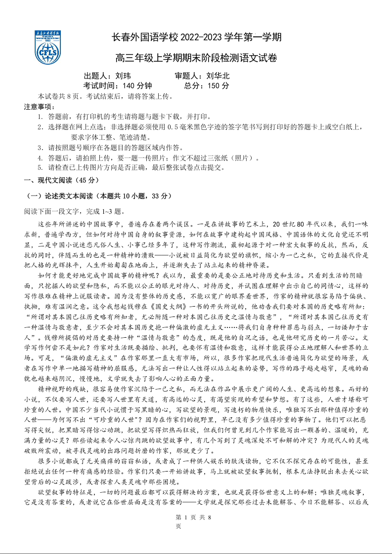 高三语文+答案--吉林省长春外国语学校2023届高三上学期期末考试