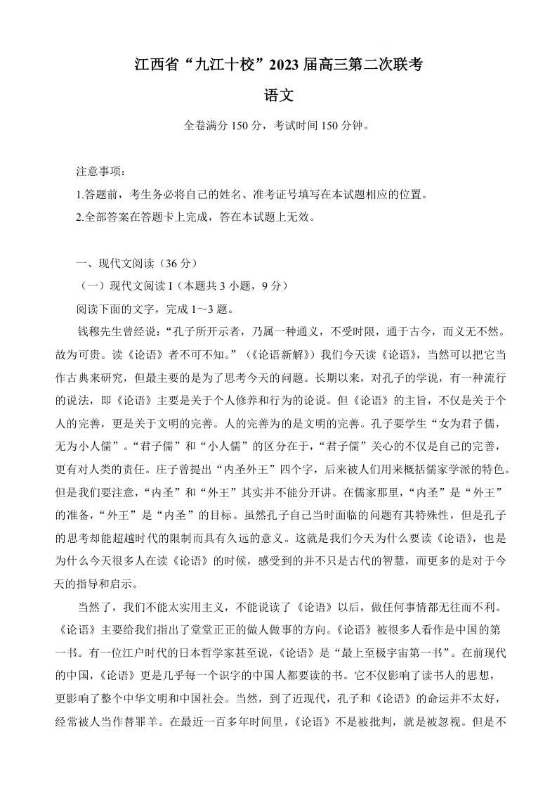 高三语文--江西省九江十校2023届高三第二次联考2.2-3