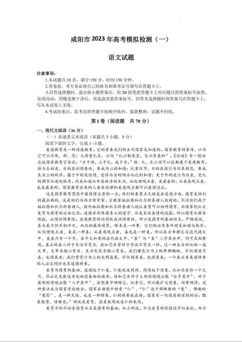 高三语文--陕西省咸阳市2023届高考模拟检测(一)