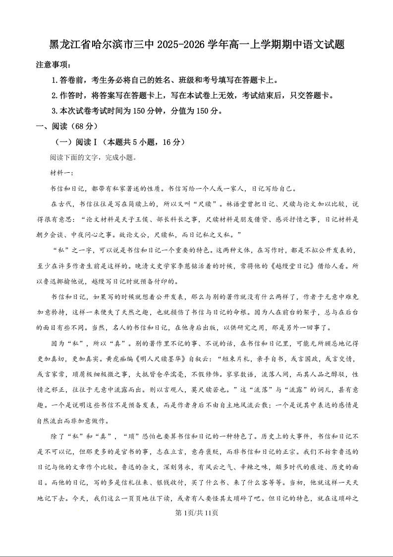 高一语文(原卷版)--黑龙江省哈尔滨市第三中学校2025-2026学年高一上学期期中考试