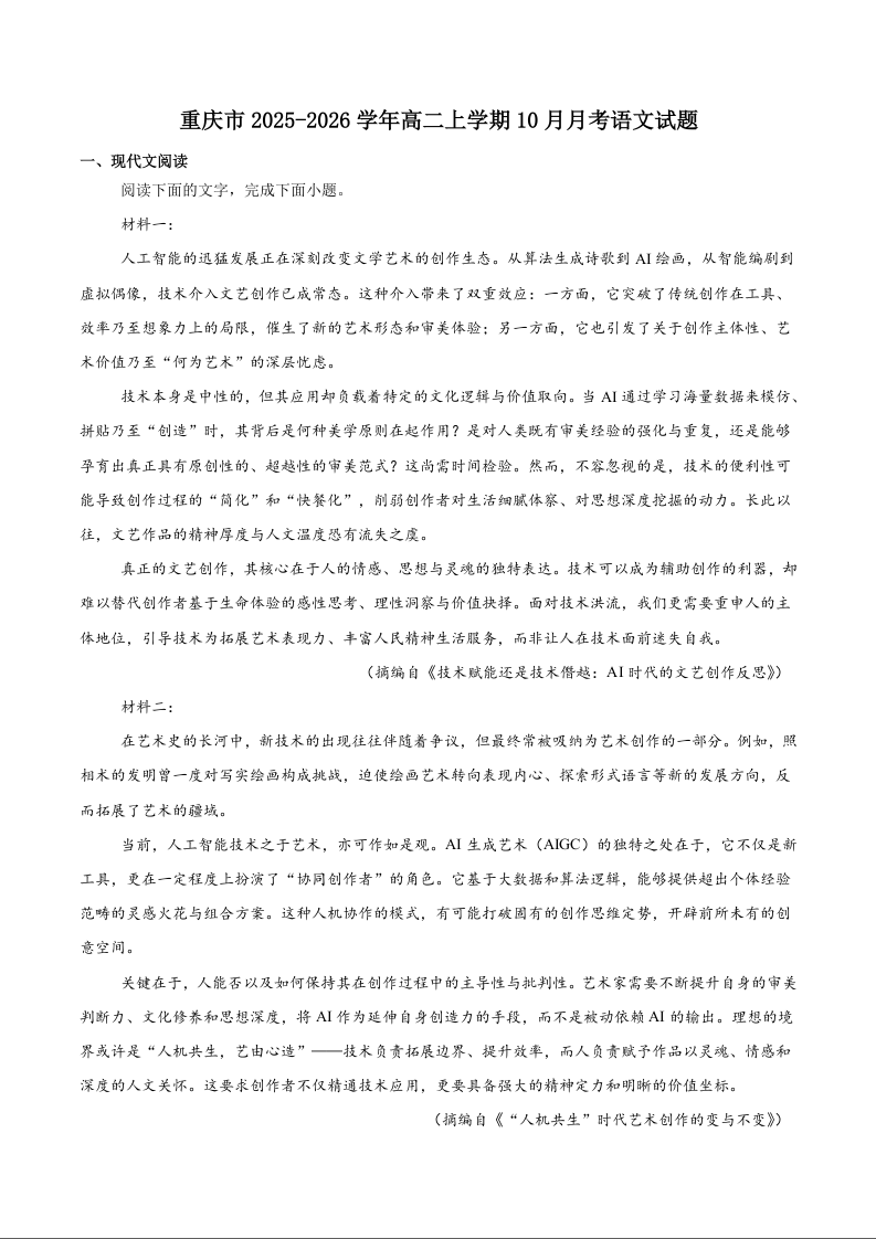 高二语文+答案--重庆市2025-2026学年高二上学期10月月考