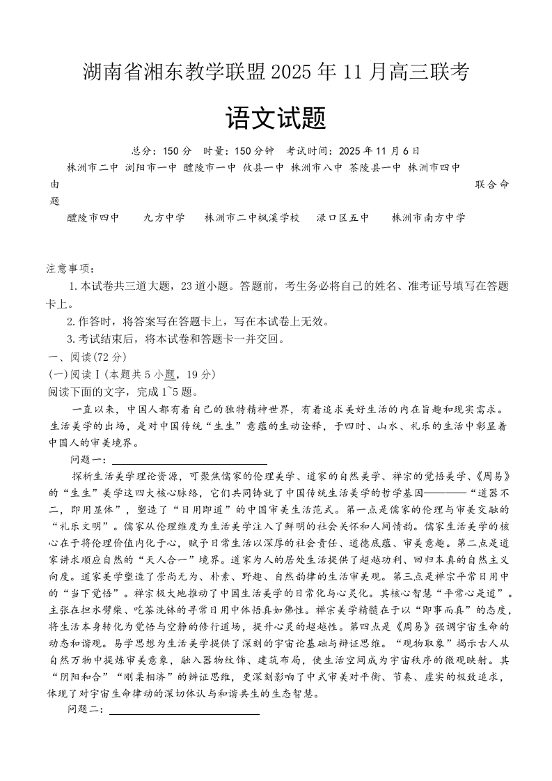 高三语文+答案--湖南省湘东教学联盟2026届高三上学期11月联考