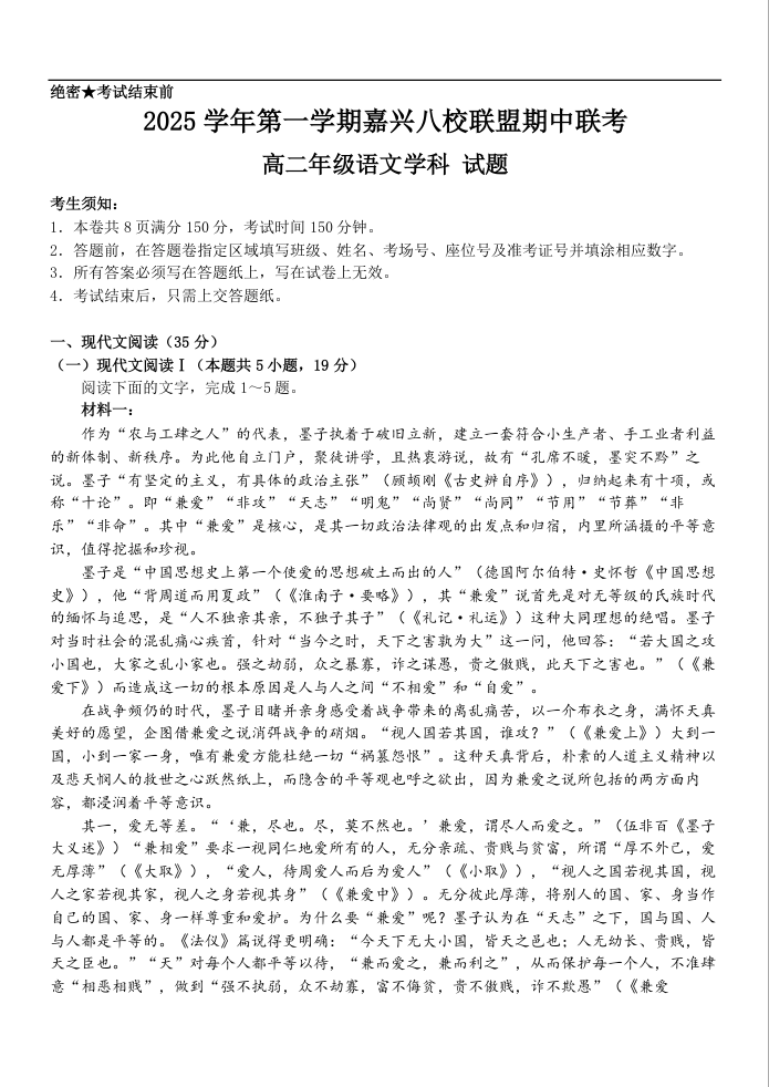 高二语文+答案--浙江省嘉兴市八校联盟2025-2026学年高二上学期期中考试