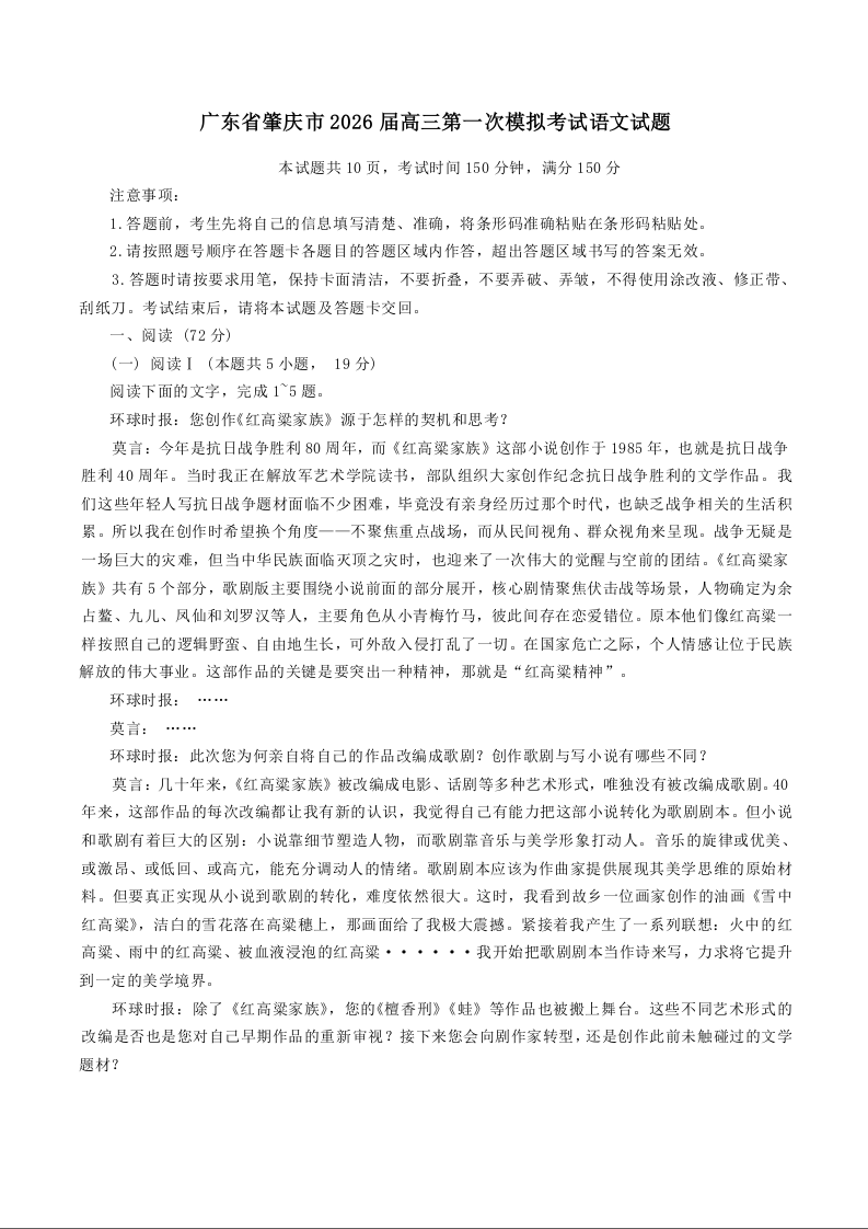 高三语文 +答案--广东省肇庆市2026届高三上学期第一次模拟考试(肇庆一模)