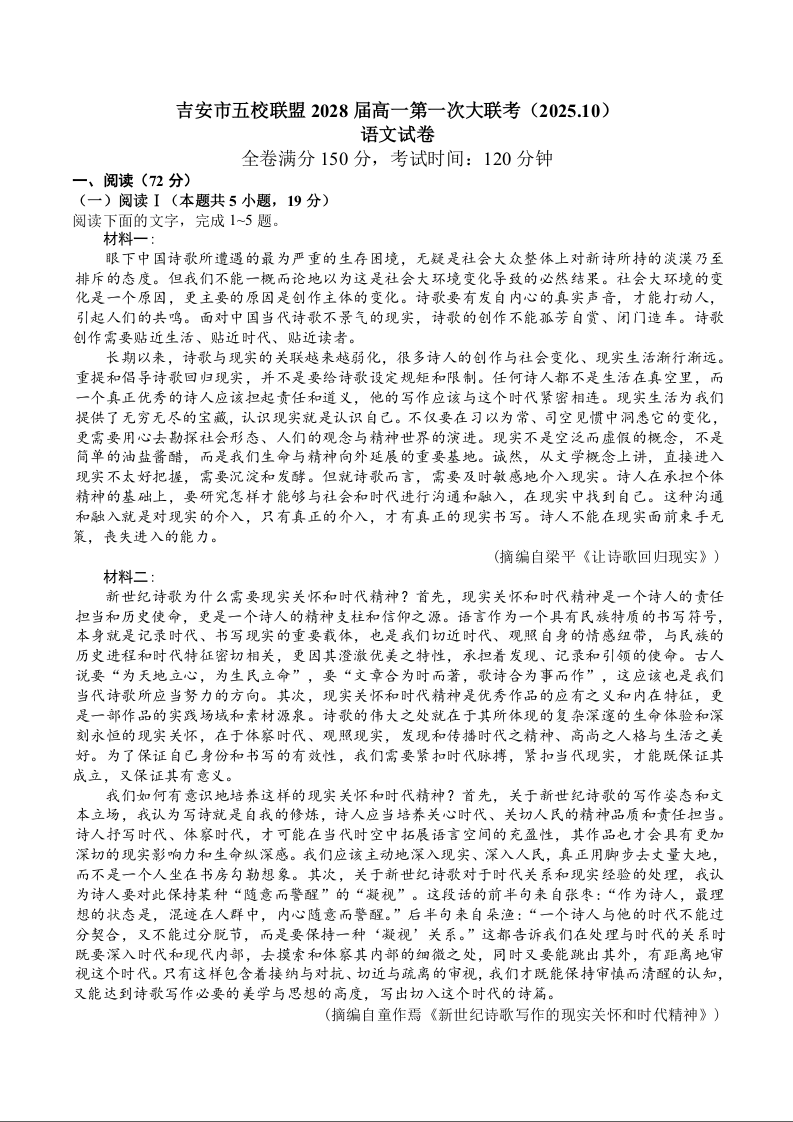 高一语文+答案--江西省吉安市五校联盟2025-2026学年高一上学期第一次大联考