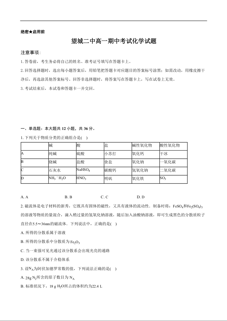 高一化学--湖南省长沙市望城区第二中学2025-2026学年高一上学期11月期中考试