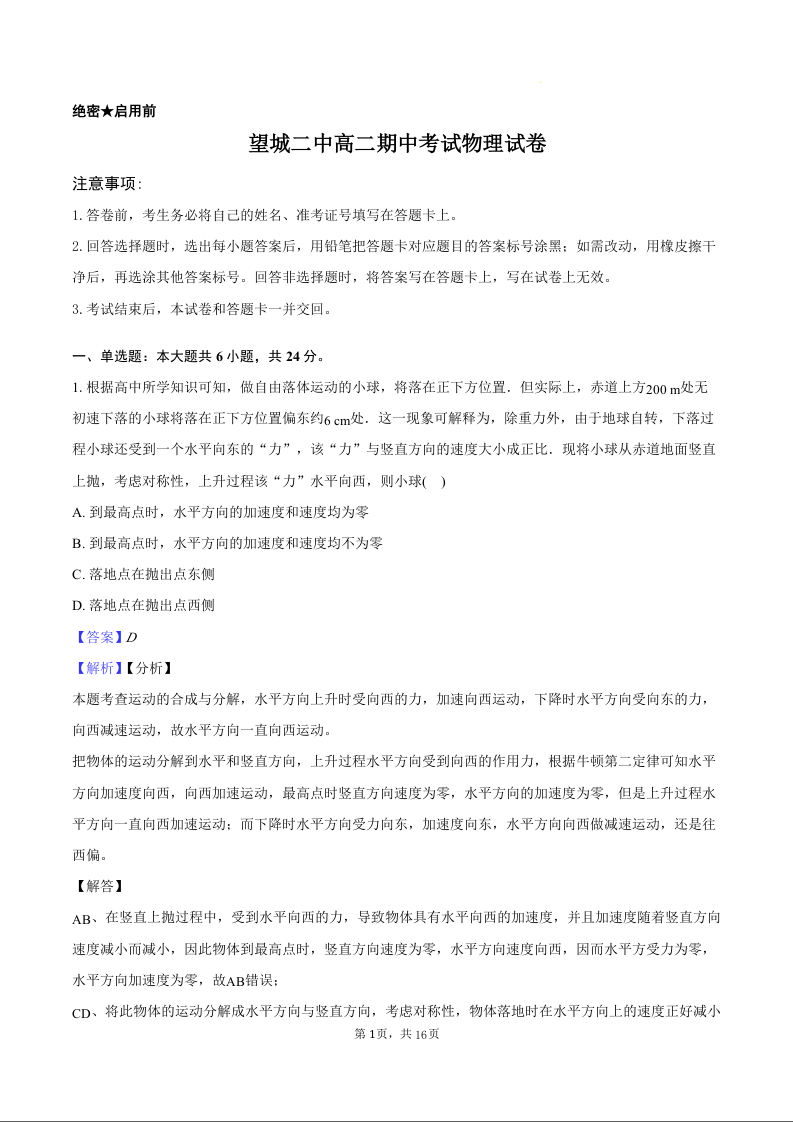 高二物理答案--湖南省长沙市望城区第二中学2025-2026学年高二上学期11月期中考试