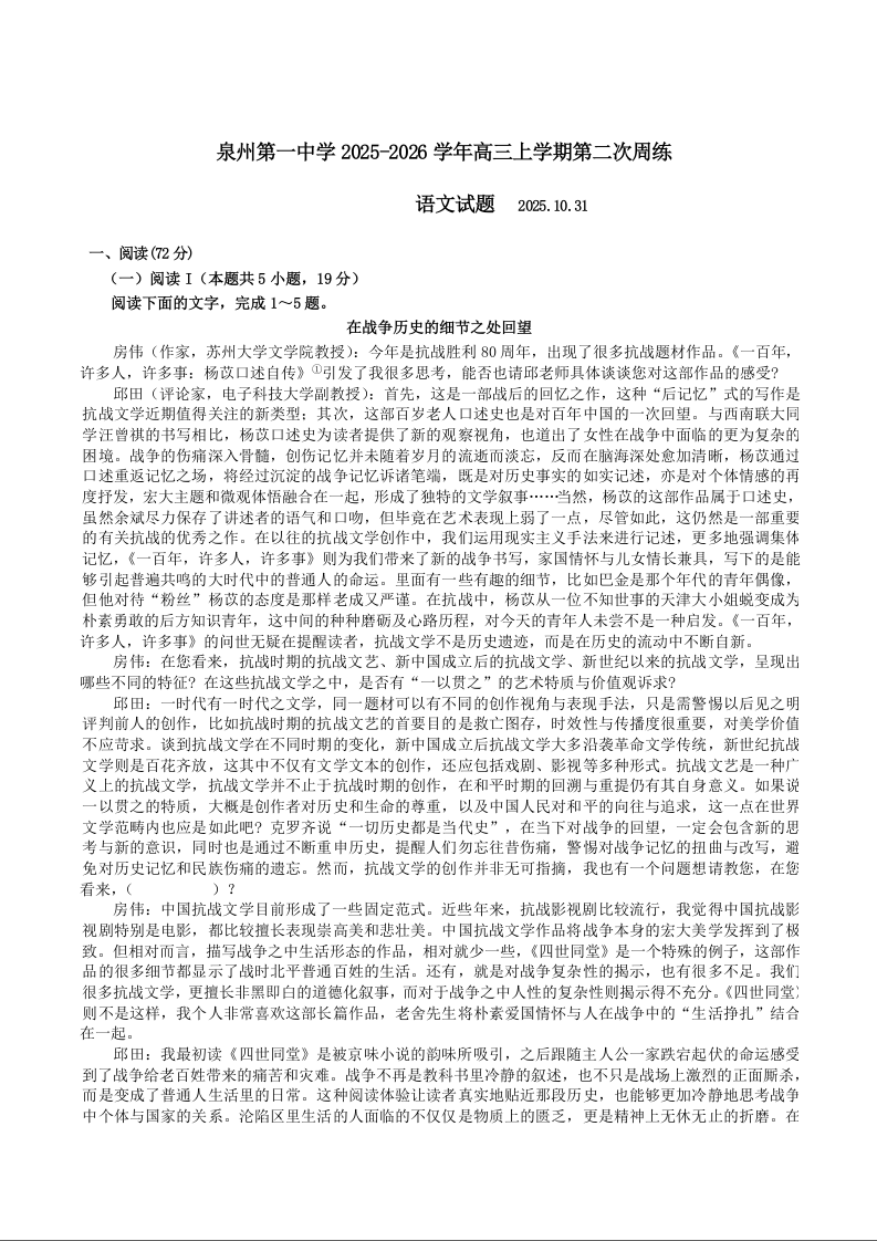 高三语文+答案--福建省泉州第一中学2026届高三上学期10月第二次月考