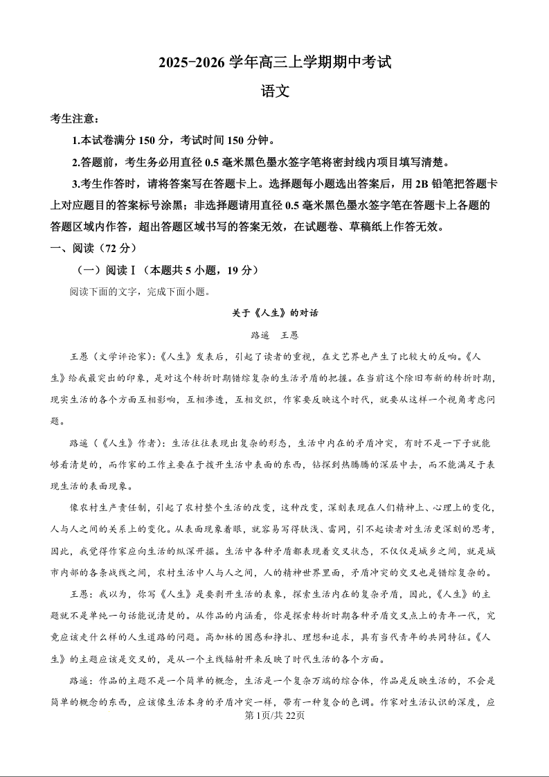 高三语文(精品解析版)--云南省曲靖市第一中学2026届高三上学期11月期中考试