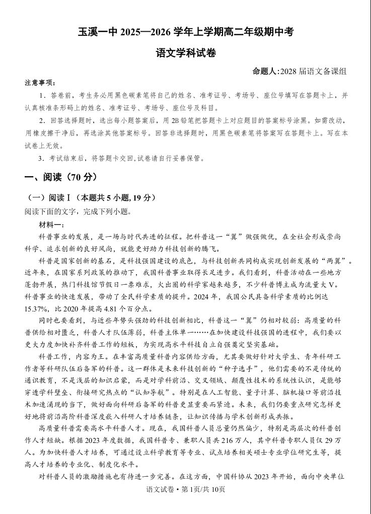 高二语文--云南省玉溪第一中学2025-2026学年高二上学期期中考试