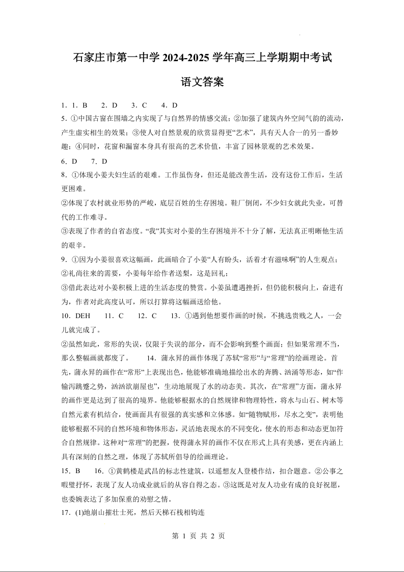 高三语文答案--河北省石家庄市第一中学2026届高三上学期11月期中考试
